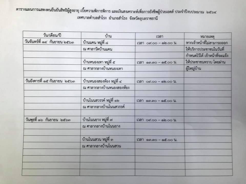 ชื่อเรื่อง : เทศบาลตำบลสำโรง จะดำเนินการตรวจสอบและจัดทำทะเบียนประวัติ ผู้มีสิทธิได้รับเงินสงเคราะห์ ผู้สูงอายุ คนพิการ และ ผู้ป่วยเอดส์