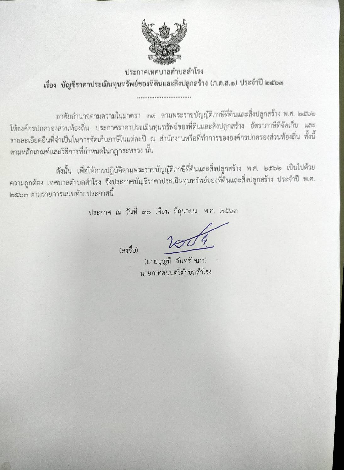 ประกาศ บัญชีราคาประเมินทุนทรัพย์ของที่ดินและสิ่งปลูกสร้าง (ภ.ด.ส.๑) ประจำปี ๒๕๖๓