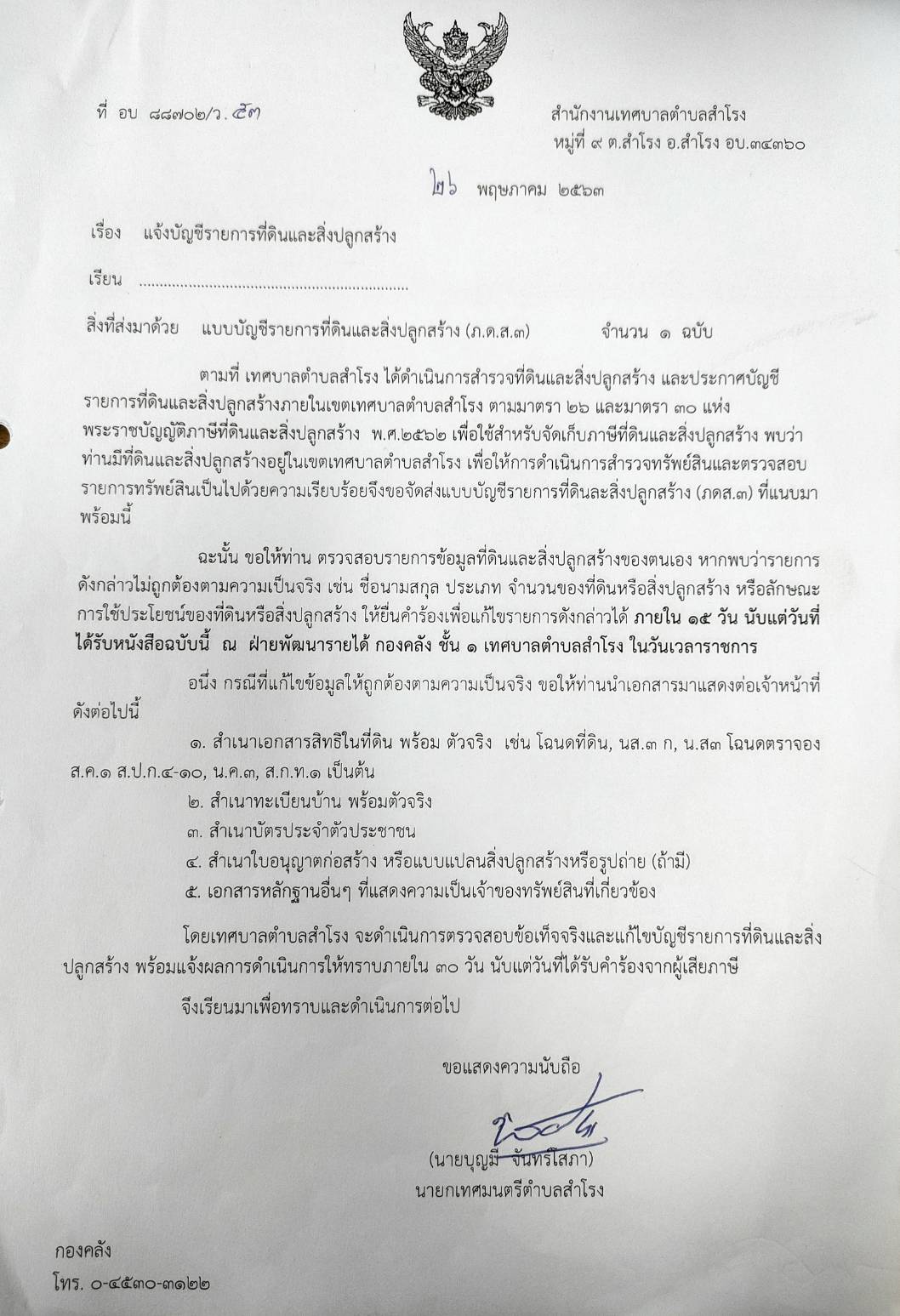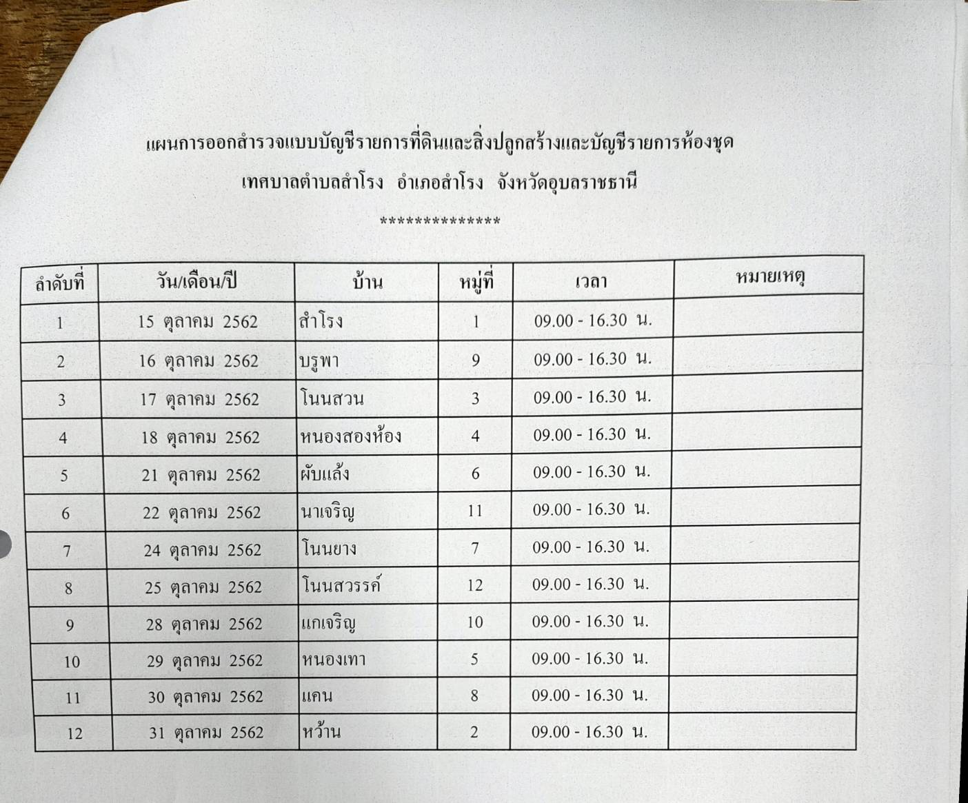 ประกาศกำหนดระยะเวลาและแผนออกสำรวจที่ดินและสิ่งปลูกสร้าง ในเขตเทศบาลตำบลสำโรง ตั้งแต่วันที่ 15-31 ตุลาคม พ.ศ. 2562