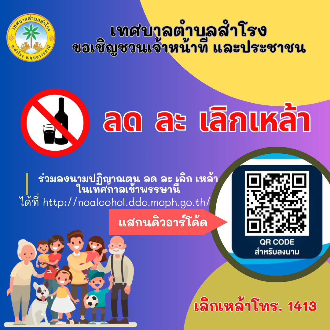 รายละเอียด : ร่วมลงนามปฏิญาณตนผ่านระบบลงนามออนไลน์ ลด ละ เลิกเหล้า ผ่านช่องทาง Link http://noalcohol.ddc.moph.go.th/ หรือแสกนคิวอาร์โค้ด