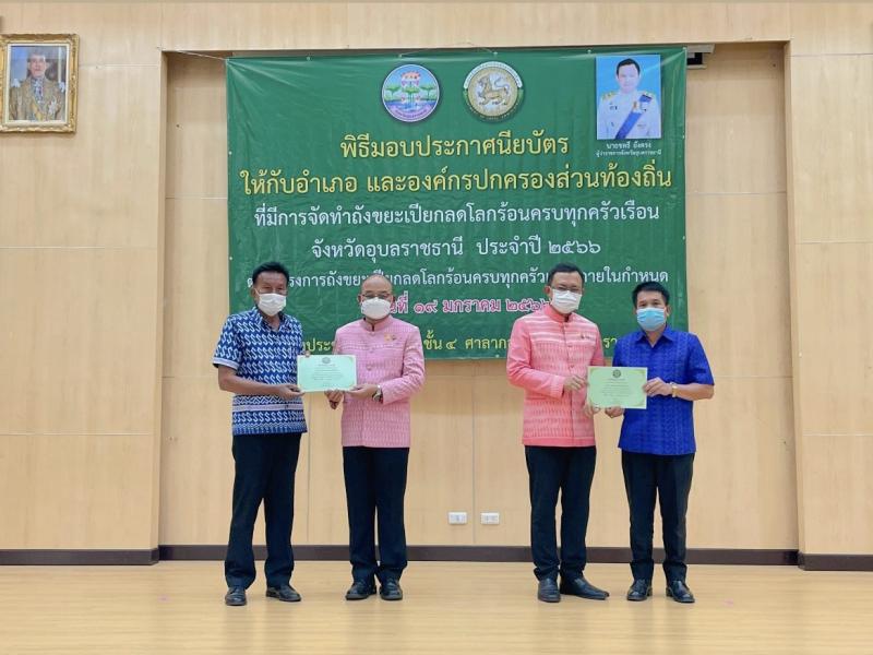 นายสมศรี สิมาวัน นายกเทศมนตรีเทศบาลตำบล สำโรง รับมอบประกาศนียบัตร ให้กับอำเภอ และองค์กรปกครองส่วนท้องถิ่น ที่มีการจัดทำถังขยะเปียกลดโลกร้อนครบทุกครัวเรือน จังหวัดอุบลราชธานี ประจำปี ๒๕๖๖ ตามโครงการถังขยะเปียกลดโลกร้อนครบทุกครัวเรือนภายในกำหนด