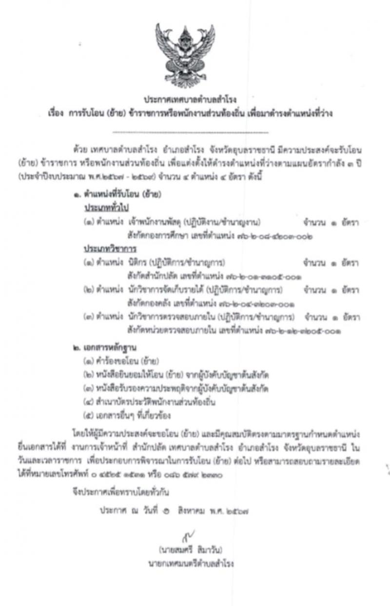 ประชาสัมพันธ์การรับโอน เทศบาลตำบลสำโรง อำเภอสำโรง จังหวัดอุบลราชธานี มีความประสงค์จะรับโอน (ย้าย) ข้าราชการ หรือพนักงานส่วนท้องถิ่น เพื่อแต่งตั้งให้ดำรงตำแหน่งที่ว่างตามแผนอัตรากำลัง 3 ปี (ประจำปีงบประมาณ พ.ศ.2567-2569) จำนวน 4 ตำแหน่ง 4 อัตรา ดังนี้